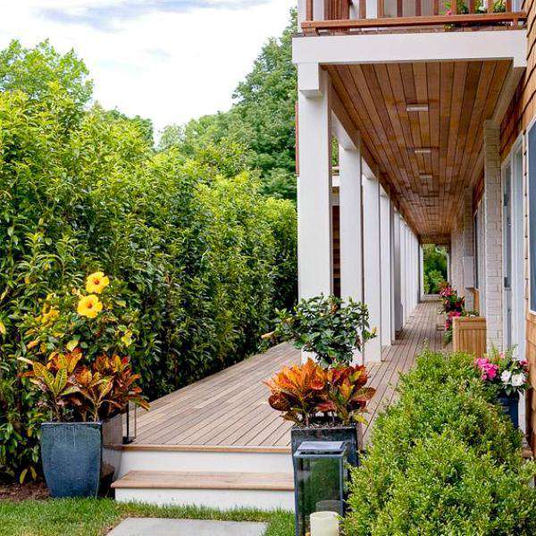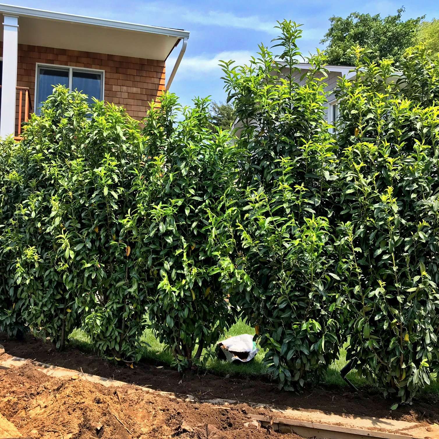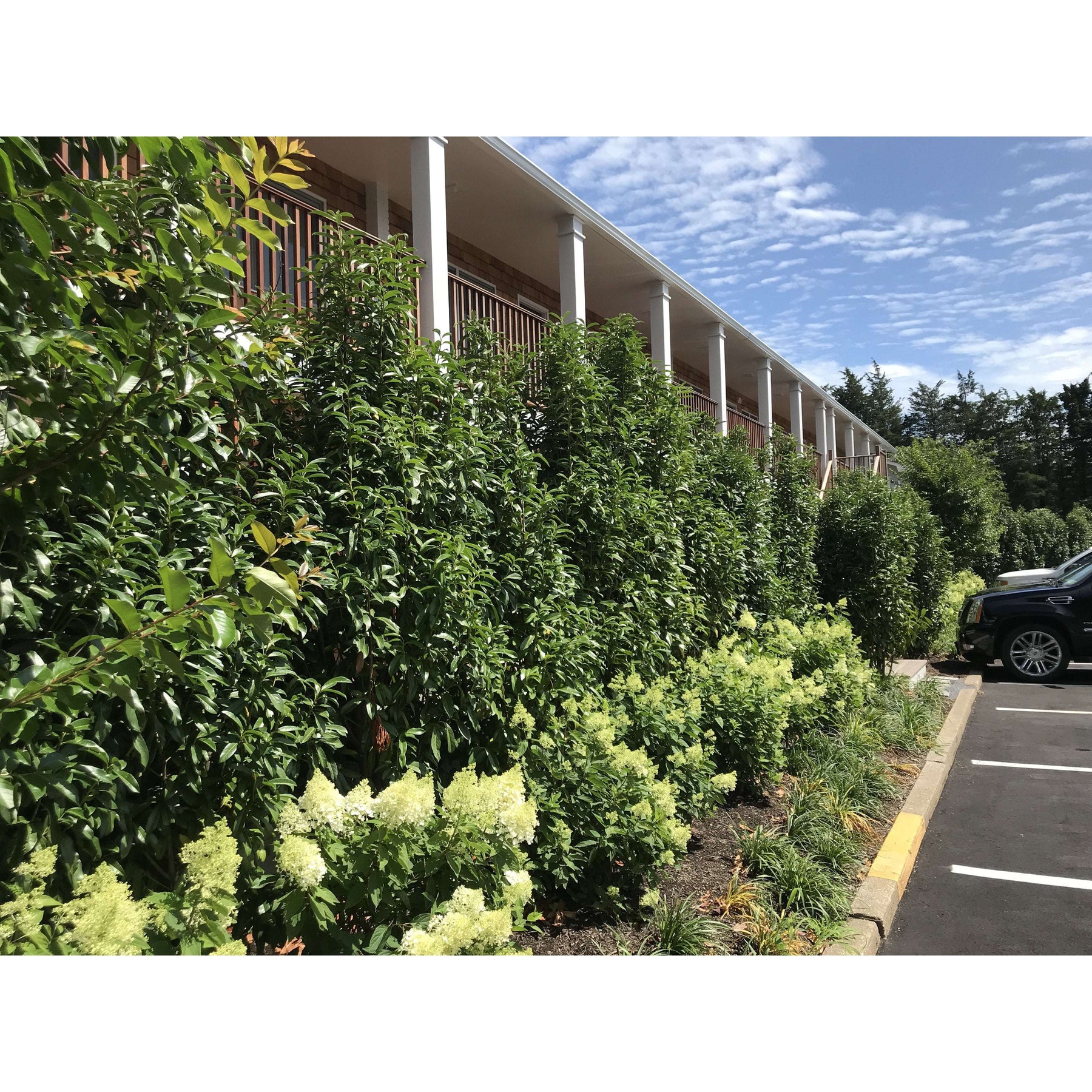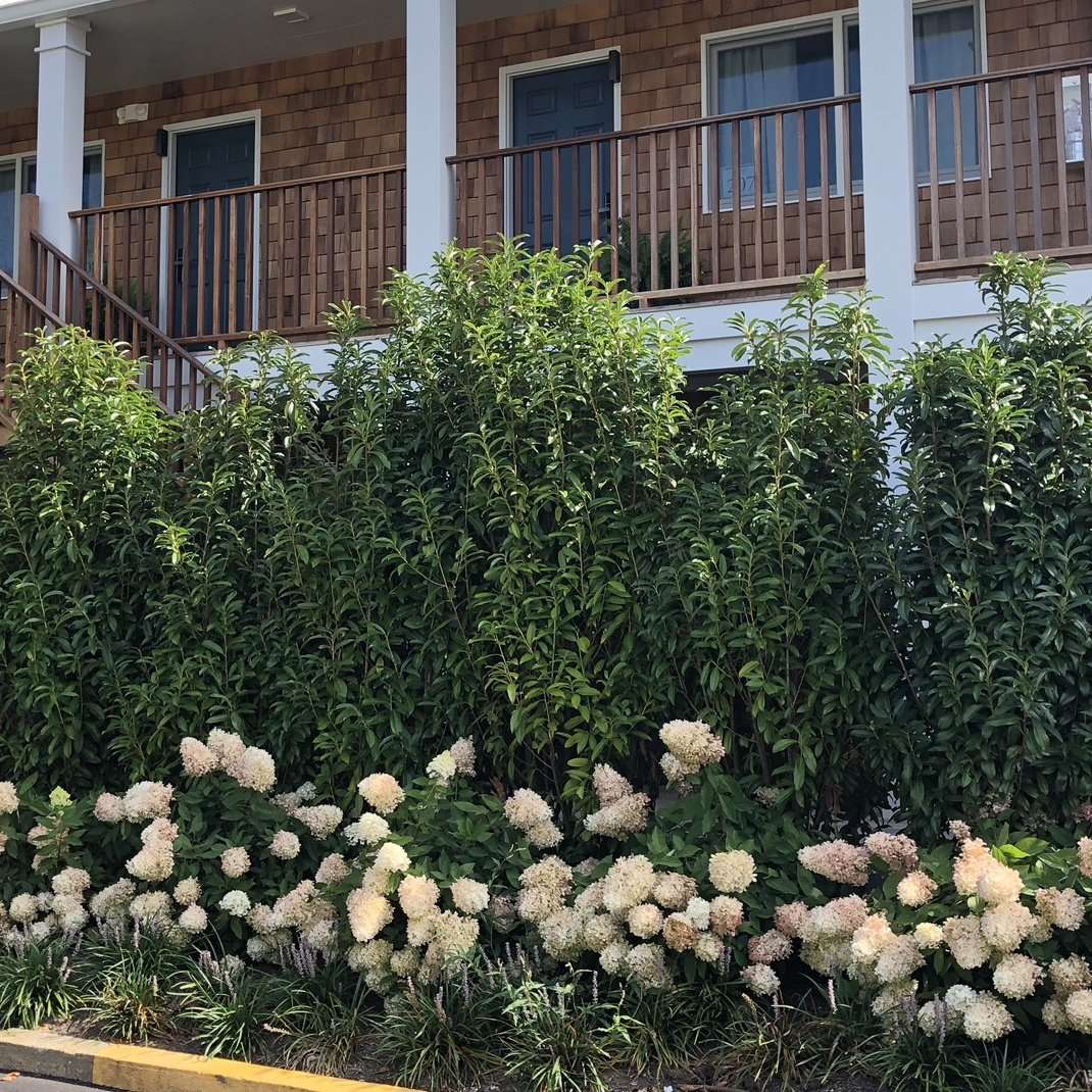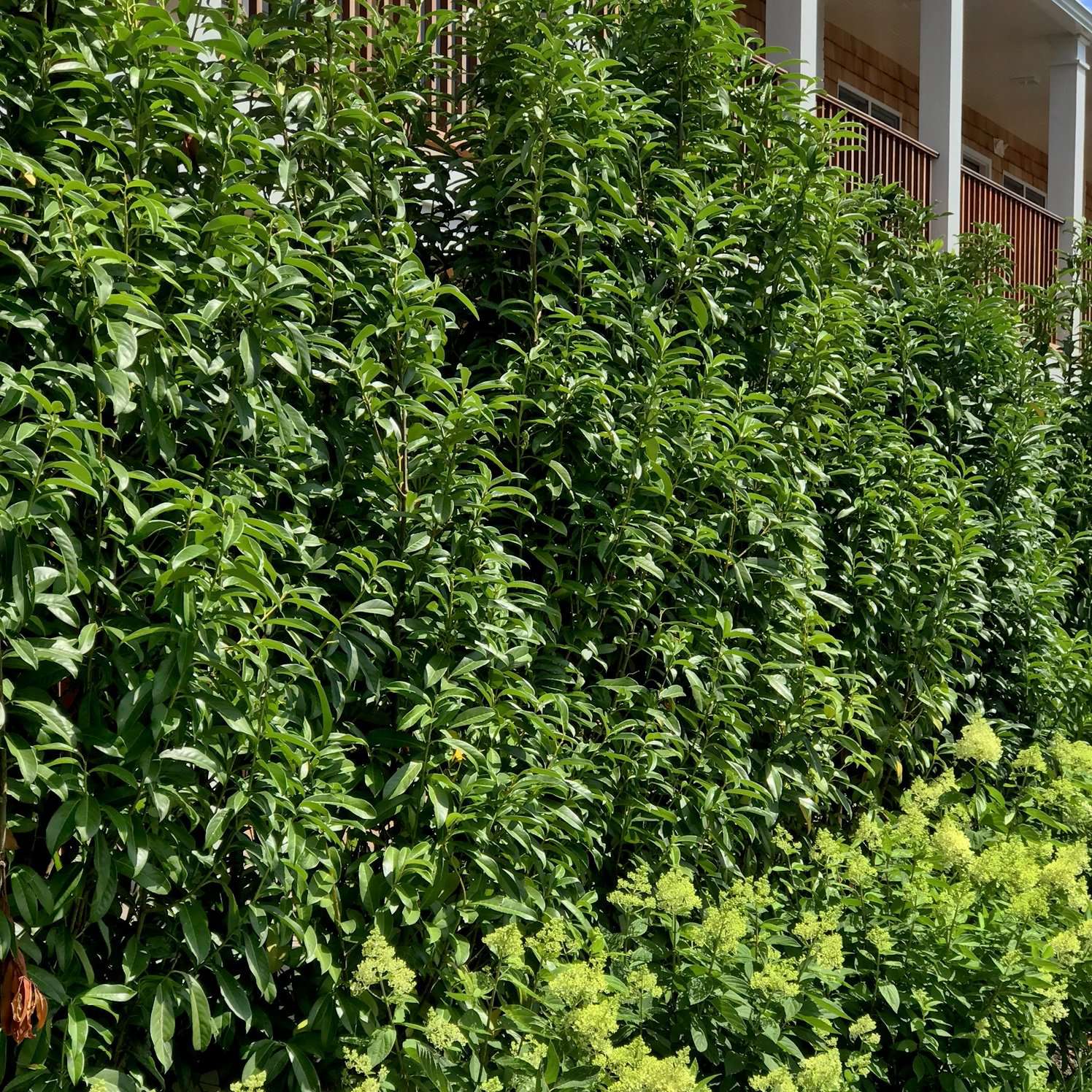 As seen in our photos, 'Mariblon' Laurel make an excellent evergreen privacy hedge.