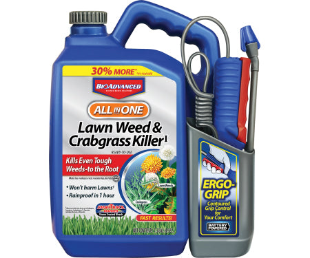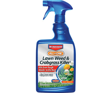 All-In-One Lawn Weed & Crabgrass Killer kills lawn weeds plus crabgrass in one easy step. Kills dandelion, clover, chickweed and more and will not harm your lawn when used as directed. Rainproof in one hour. Kills 200+ weeds. Ready-to-Use formulas contain SmartTrack, a non-staining marker that indicates where you've sprayed. Active ingredients concentrate: 4.85% 2,4-D, dimethylamine salt ; 1.61% quinclorac, 0.45% dicamba, dimethylamine salt. Active ingredients Ready to Use: 0.313% 2,4-D, dimethylamine salt ; 0.104% quinclorac, 0.029% dicamba, dimethylamine salt.