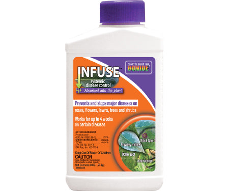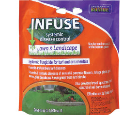 Infuse Lawn And Landscape Systemic Disease Control can be used for turf and ornamentals. Ready-to-spray applicator for maximum convenience treating lawns, trees, fruit and flower beds. Won't wash off. Lasts up to one month. Prevents and cures. Active ingredient: 1.55% Propiconazole (Banner).
