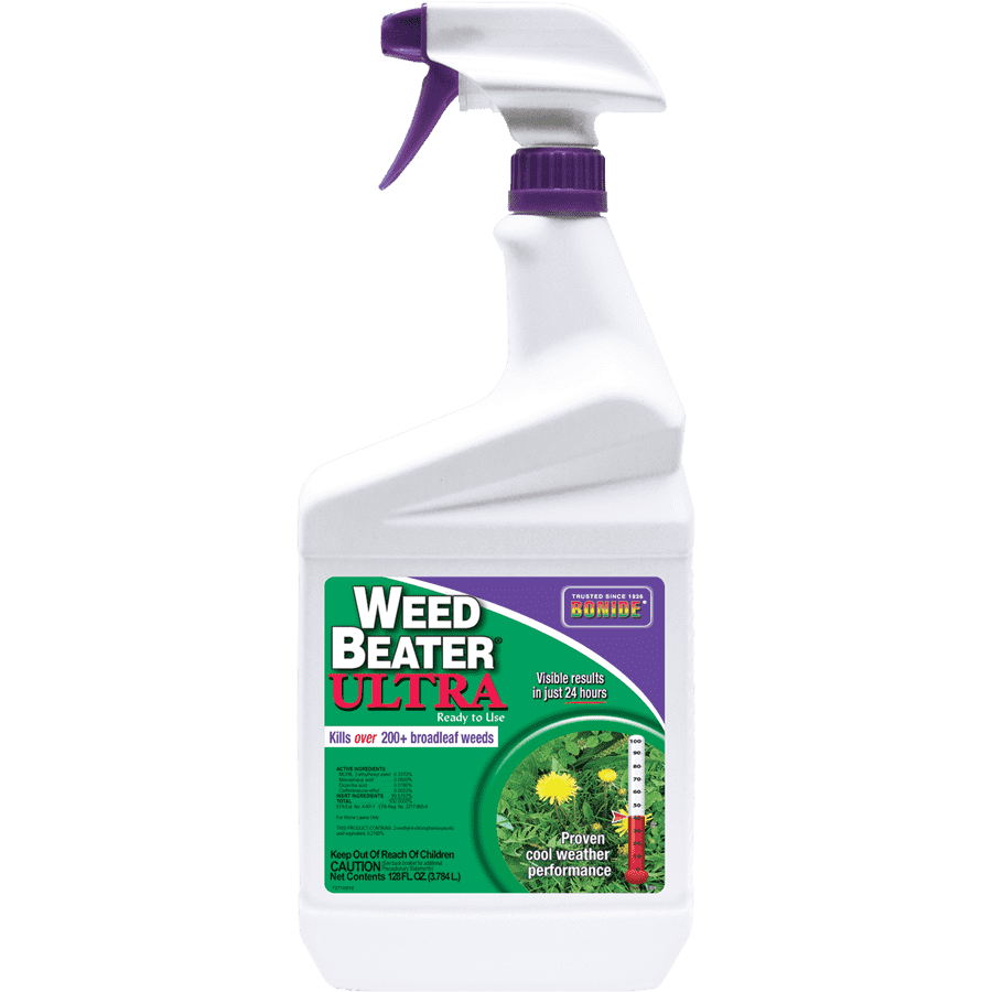 Effective on over 200 hard to kill weeds, right to the roots. Visible results in just 24 hours, rain fast once dry, and re-seed in just 2 weeks! Superior cool weather performance down to 45 degreesF extends application window. Product features "See Spray" non-staining blue marker dye. Contains : MCPA, mecoprop-p, dicamba and carfentrazone.
