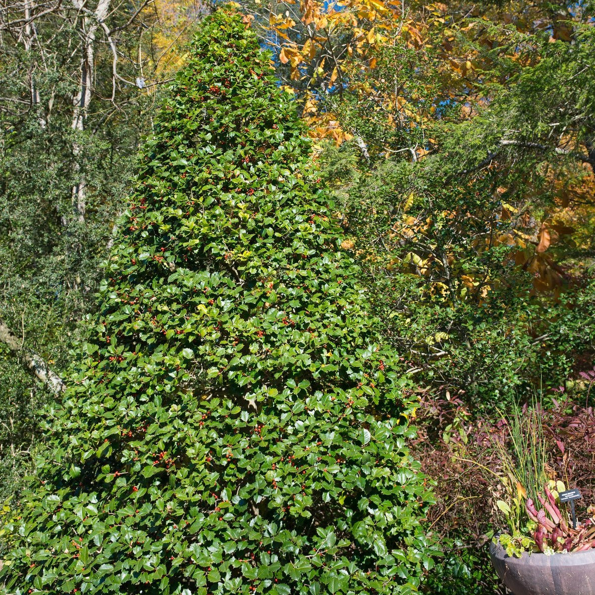 American Hollies are a popular evergreen tree. Normally pruned to be kept as small trees or shrubs. They will berry in fall through spring. Berries are bright red and are very popular to use in winter decoration. Dense foliage provides cover and nesting habitat for various birds. Ilex opaca