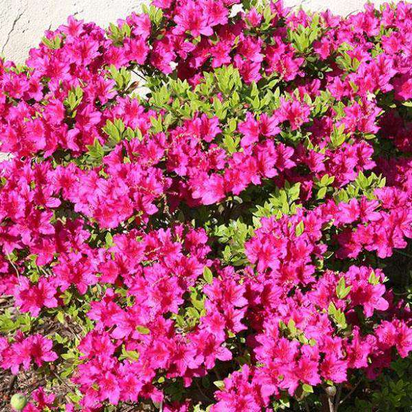 Ruffled 2" electric fuchsia/raspberry single flower, extra-glossy foliage turns to a gorgeous wine in winter, compact upright habit. This beautiful hardy azalea thrives in USDA zone 6 despite the chilling winters! A stunning profusion of single, fuchsia-colored blooms blankets the lush, green foliage in the spring. A premier flowering shrub for use as a hedge, in borders or in groupings. Loves the dappled sunlight of a woodland garden. Semi-evergreen.