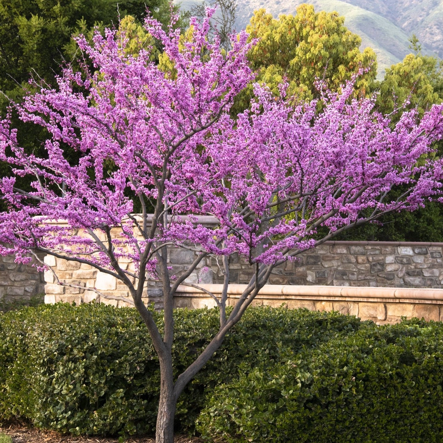 Those large, heart shaped leaves also are striking, emerging a glossy bright burgundy and fading to matte purple-green during summer. In autumn , the tree may don a coat of many colors, with foliage that turns burgundy, orange, and yellow before it falls. This deciduous redbud can grow to 30 feet in height and 35 feet in width in USDA zones 5-9—often multi-trunks with a vase-like shape.